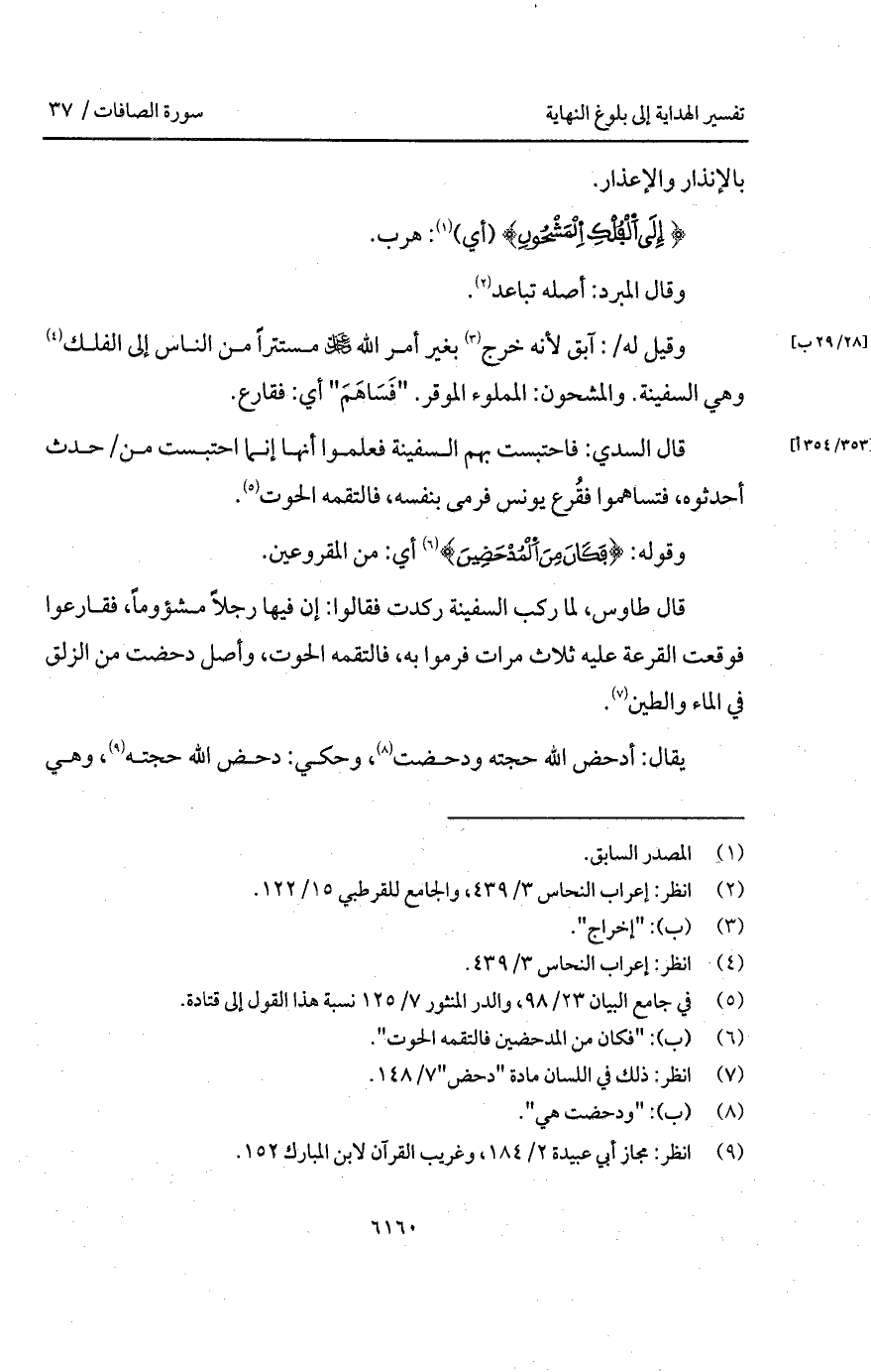 وقيل له/: آبق لأنه خرج بغير أمر الله D مستتراً من الناس إلى الفلك وهي السفينة. والمشحون: المملوء الموقر. " فَسَاهَمَ " أي: فقارع.