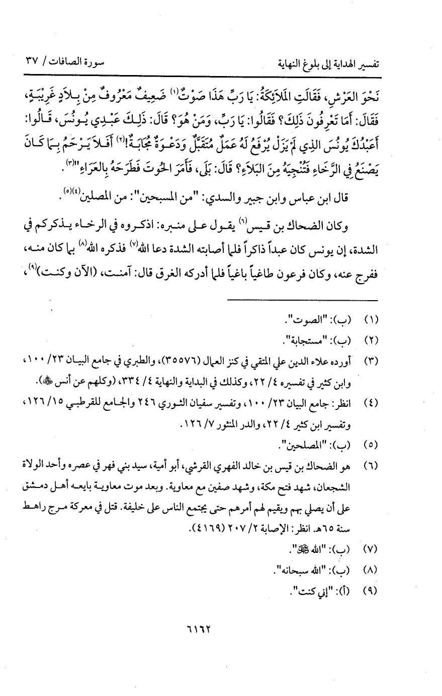 نَحْوَ العَرْشِ، فَقَالَتِ المَلاَئِكَةُ: يَا رَبِّ هَذَا صَوْتٌ ضَعِيفٌ مَعْرُوفٌ مِنْ بِلاَجٍ غَرِيْبَةٍ، فَقَالَ: أَمَا تَعْرِفُونَ ذَلِكَ؟ فَقَالُوا: يَا رَبِّ، وَمَنْ هُوَ؟ قَالَ: ذَلِكَ عَبْدِ يُونُسَ، قَالُوا: أَعَبْدُكَ يُونُسَ الذِي لِمْ يَزَلْ يُرْفَعُ لَهُ عَمَلٌ مُتَقَبَّلٌ وَدَعْوَةٌ مُجَابَةٌ! أَفَلاَ يَرْحَمُ بِمَا كَأنَ يَصْنَعُ فِي الرَّخَاءِ فَتُنْجِيَهُ مِنَ البَلاَءِ؟ قَالَ: بَلَى، فَأَمَرَ الحُوتَ فََطَرَحَهُ بِالعَرَاءِ ".
