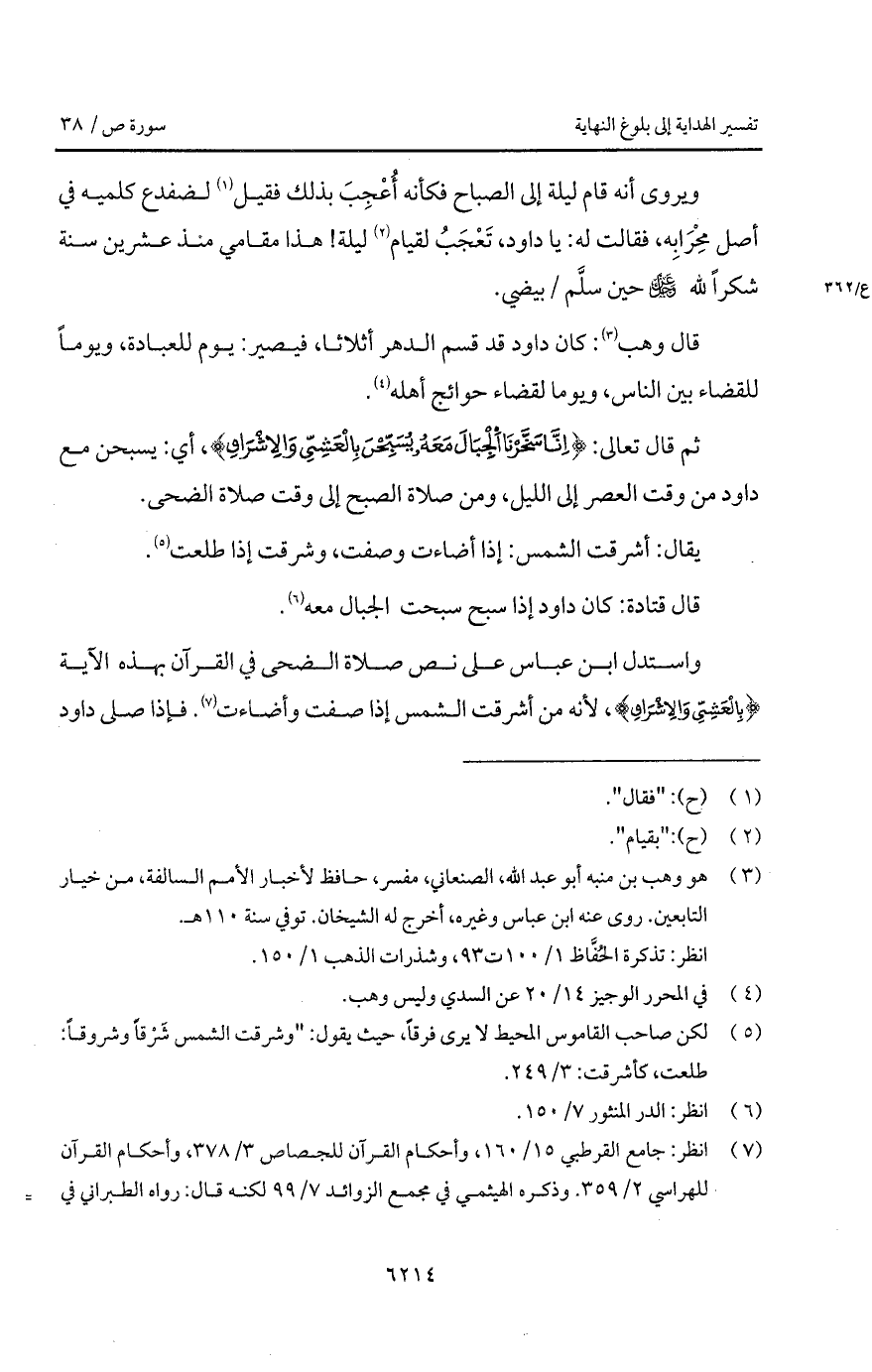 واستدل ابن عباس على نص صلاة الضحى في القرآن بهذه الآية {بالعشي والإشراق}، لأنه من أشرقت الشمس إذا وصفت وأضاءت. فإذا صلى داود