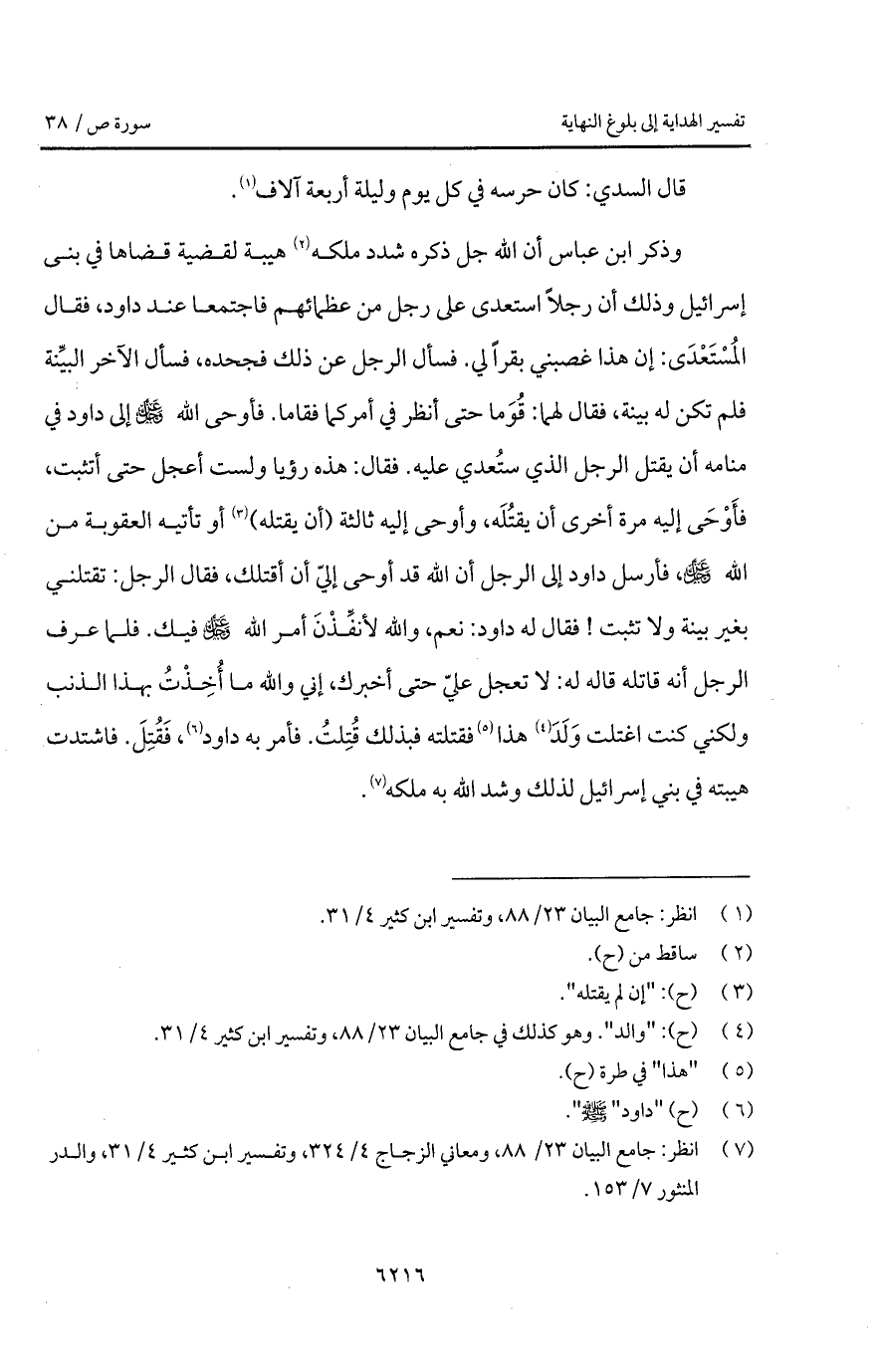 وذكر ابن عباس أن الله جل ذكره شدد ملكه هيبة لقضية قضاها في بنى إسرائيل وذلك أن رجلاً استعدى على رجل من عظمائهم فاجتمعا عند داود، فقال المُسْتَعْدَى: إن هذا غصبني بقراً لي. فسأل الرجل عن ذلك فجحده، فسأل الآخر البيِّنة فلم تكن له بينة، فقال لهما: قُوَما حتى أنظر في أمركما فقاما.