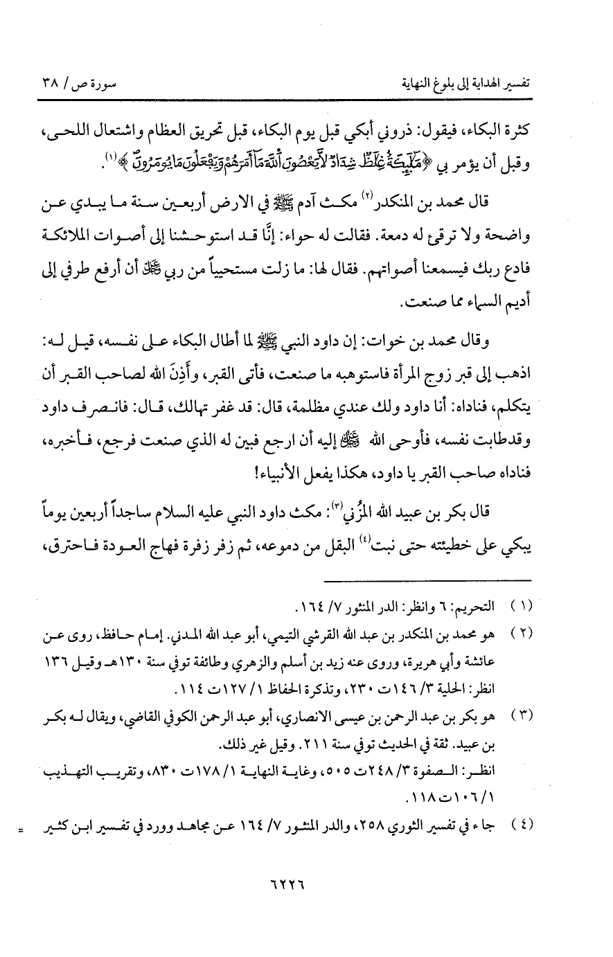 قال بكر بن عبيد الله المزُني: مكث داود النبي عليه السلام ساجداً أربعين يوماً يبكي على خطيئته حتى نبت البقل من دموعه، ثم زفر زفرة فهاج العودة فاحترق،