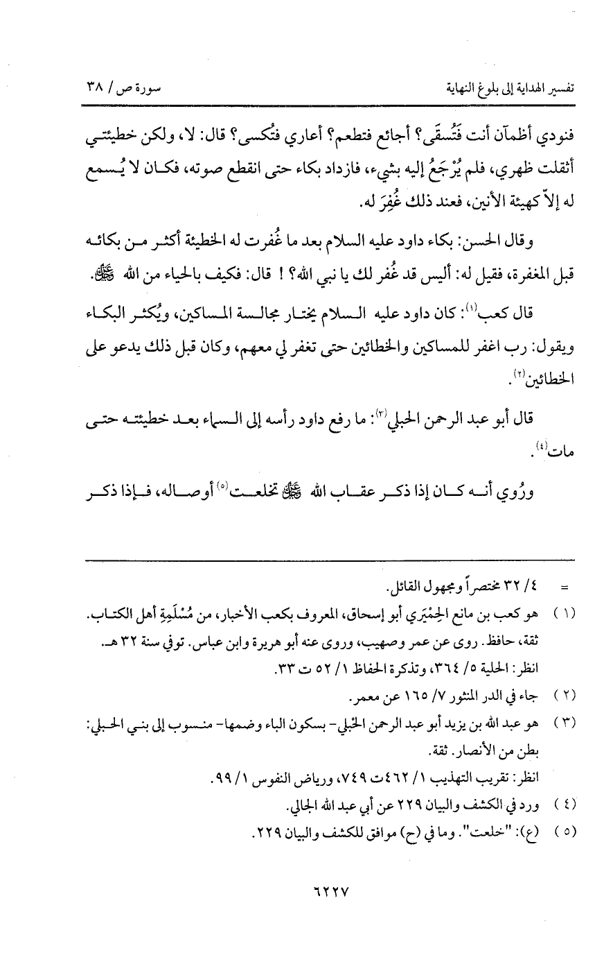 قال كعب: كان داود عليه السلام يختار مجالسة المساكين، ويُكثر البكاء ويقول: رب اغفر للمساكين والخطائين حتى تغفر لي معهم، وكان قبل ذلك يدعو على الخطائين.
