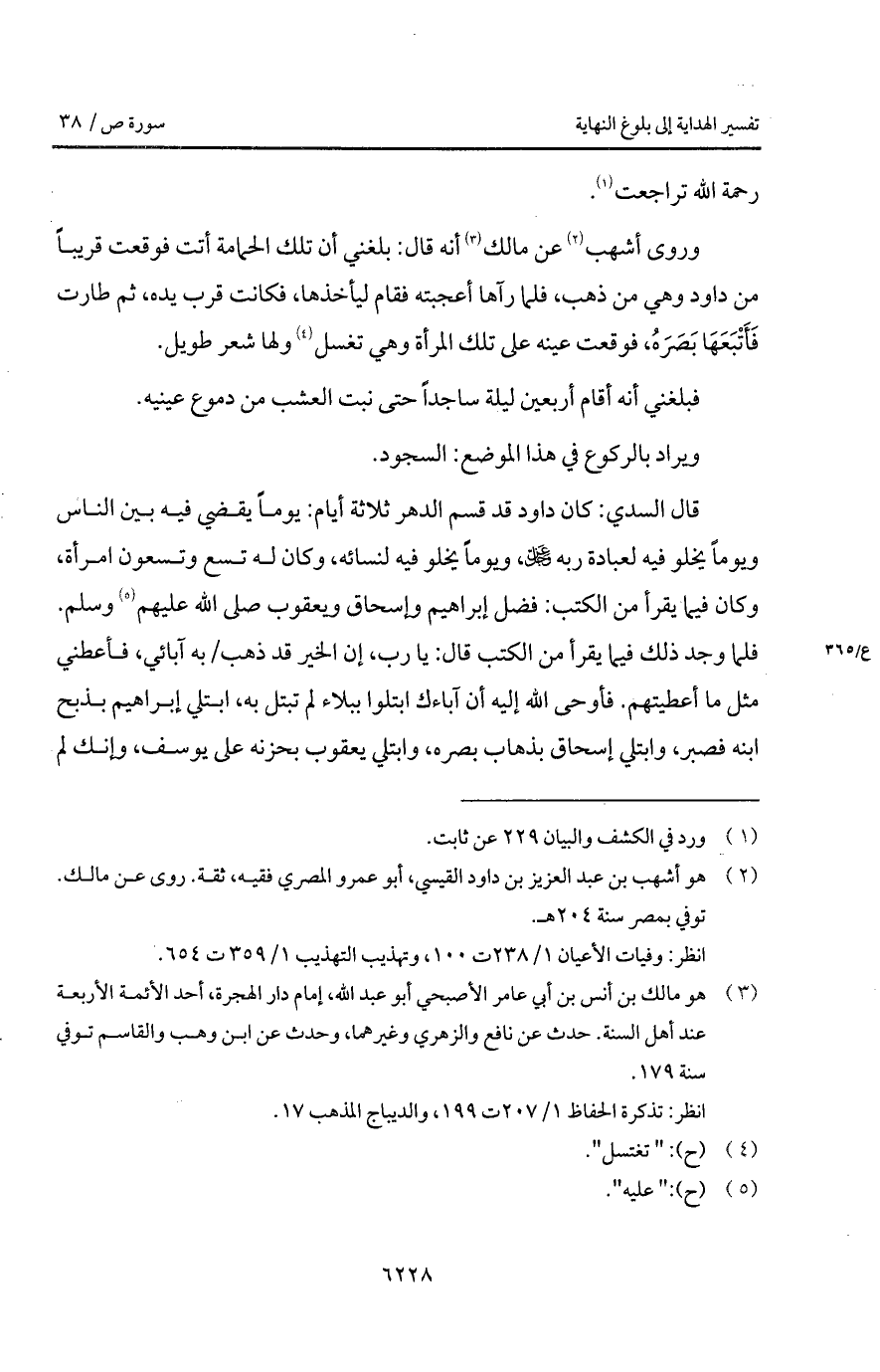 وروى أشهب عن مالك أنه قال: بلغني أن تلك الحمامة أتت فوقعت قريباً من داود وهي من ذهب، فلما رآها أعجبته فقام ليأخذها، فكانت قرب يده، ثم طارت فَاَتْبَعَهَا بَصَرَهُ، فوقعت عينه على تلك المرأة وهي تغسل ولها شعر طويل.
