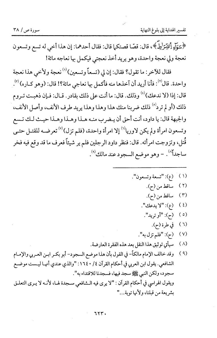 فقال للآخر: ما تقول؟ فقال: إن لي (تسعاً وتسعين) نعجة ولأخي هذا نعجة واحدة. قال: فأنا أريد أن آخذها منه فأكمل بها نعاجي مائة؟! قال: (وهو كاره). قال: إذا (لا ندعك) وذلك. قال: ما أنت على ذلك بقادر. قال: فإن ذهبت تروم ذلك (أو لم ترد ذلك ضربنا منك هذا وهذا وهذا يريد طرف الأنف، وأصل الأنف، والجبهة قال: يا داود، أنت أحق أن يضرب منه هذا وهذا حيث لك تسع وتسعون امراة ولم يكن لاوريا إلا امرأة واحدة، (فلم تزل) تعرضه للقتل حتى قُتل، وتزوجت امراته. قال: فنظر داود الرجلين فلم ير شيئاً فعرف ما قد وقع فيه فخر ساجداً. - وهو موضع السجود عند مالك.