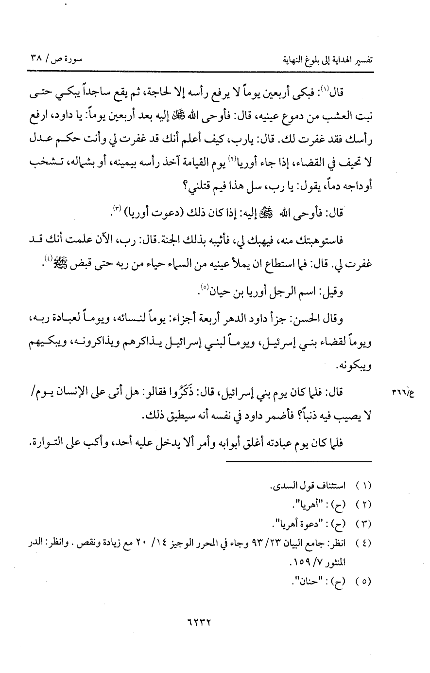 قال: فبكى أربعين يوماص لا يرفع رأسه إلا لحاجة، ثم يقع ساجداً يبكي حتى نبت العشب من دموع عينيه، قال: فأوحى الله D إليه بعد أربعين يوماً: يا داود، ارفع رأسك فقد غفرت لك. قال: يا رب، كيسف أعلم أنك قد غفرت لي وأنت حكم عدل لا تحيف في القضاء، إذا جاء أوريا يوم القيامة آخذ رأسك بيمينه، أو بشماله، تشخب أوداجه دماً، يقول: يا رب، سل هذا فيم قتلني؟
