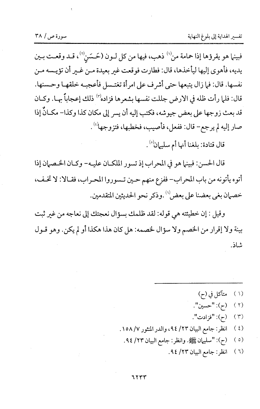 قال الحسن: فبينما هو في المحراب إذ تسور الملكان عليه - وكان الخصمان إذا أتوه يأتونه من باب المحراب - ففزع منهم حين تسوروا المحراب، فقالا: لا تخف، خصمان يغى بعضنا على بعض. وذكر نحو الحديثين المتقدمين.
