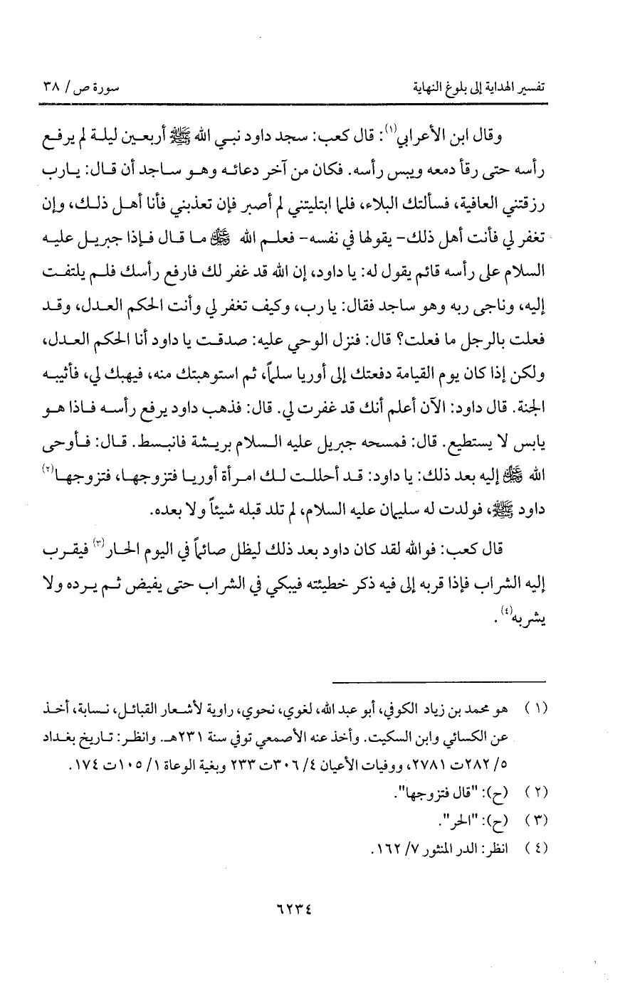 وقال ابن الأعرابي: قال كعب: سجد داود نبي الله A أربعين ليلة لم يرفع رأسه حتى رقأ دمعه ويبس رأسه.