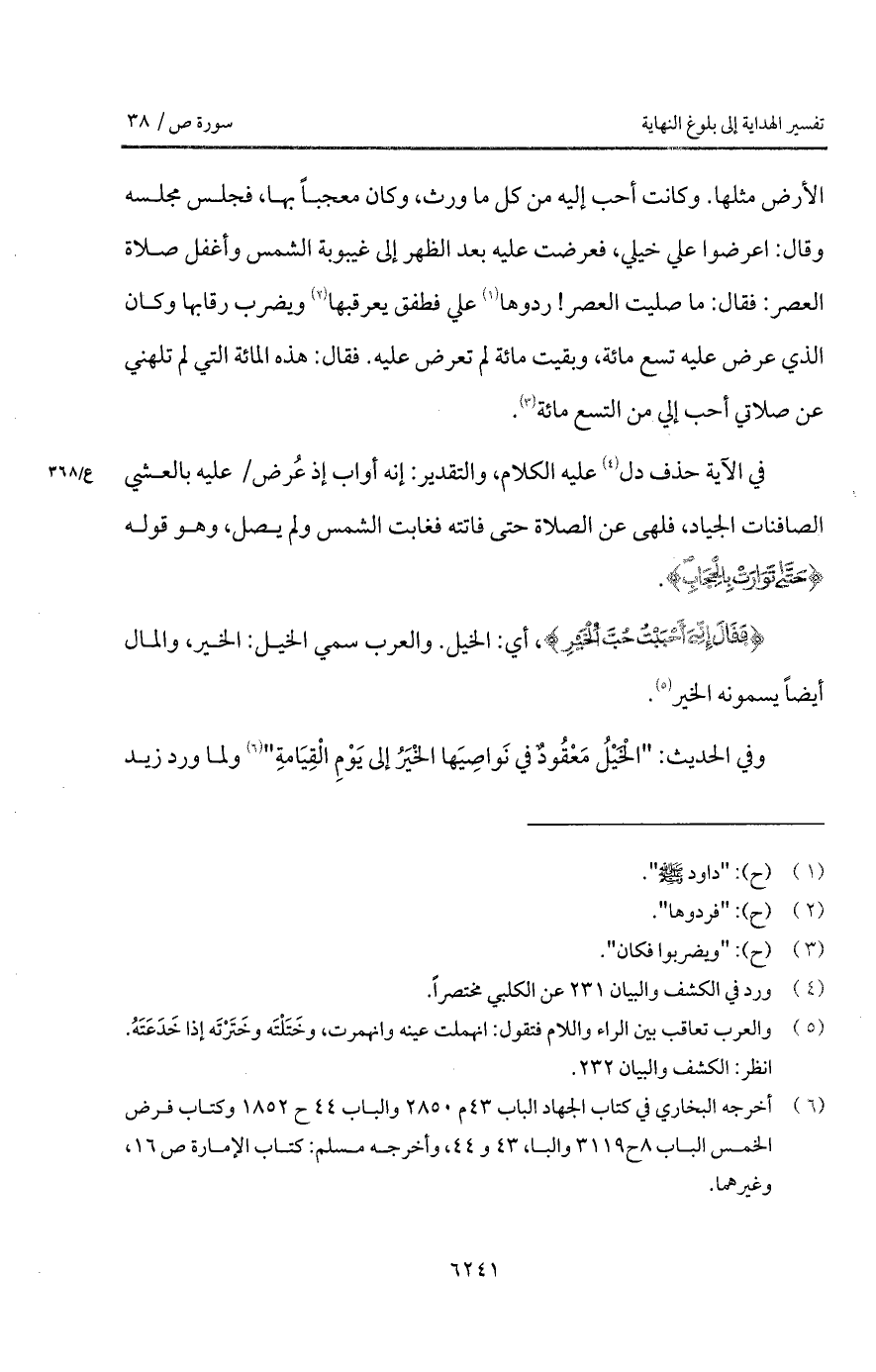 الأرض مثلها. وكان أحب إليه من كل ما ورث، وكان معجباً بها، فجلس مجلسه وقال: اعرضوا علي خيلي، فعرضت عليه بعد الظهر إلى غيبوبة الشمس وأغفل صلاة العصر: فقال: ما صليت العصر! ردوها علي فطفق يعرقبها ويضرب رقابها وكان الذي عرض عليه تسع مائة، وبقيت مائة لم تعرض عليه. فقال: هذه المائة التي لم تلهني عن صلاتي أحب إلي من التسع مائة.