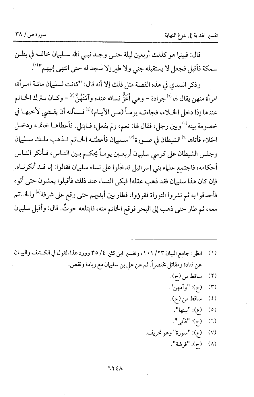 قال: فبينما هو كذلك أربعين ليلة حتى وجد نبي الله سليمان خاتمه في بطن سمكة فأقبل فجعل لا يستقبله جني ولا طير إلا سجد له حتى انتهى إليهم ".