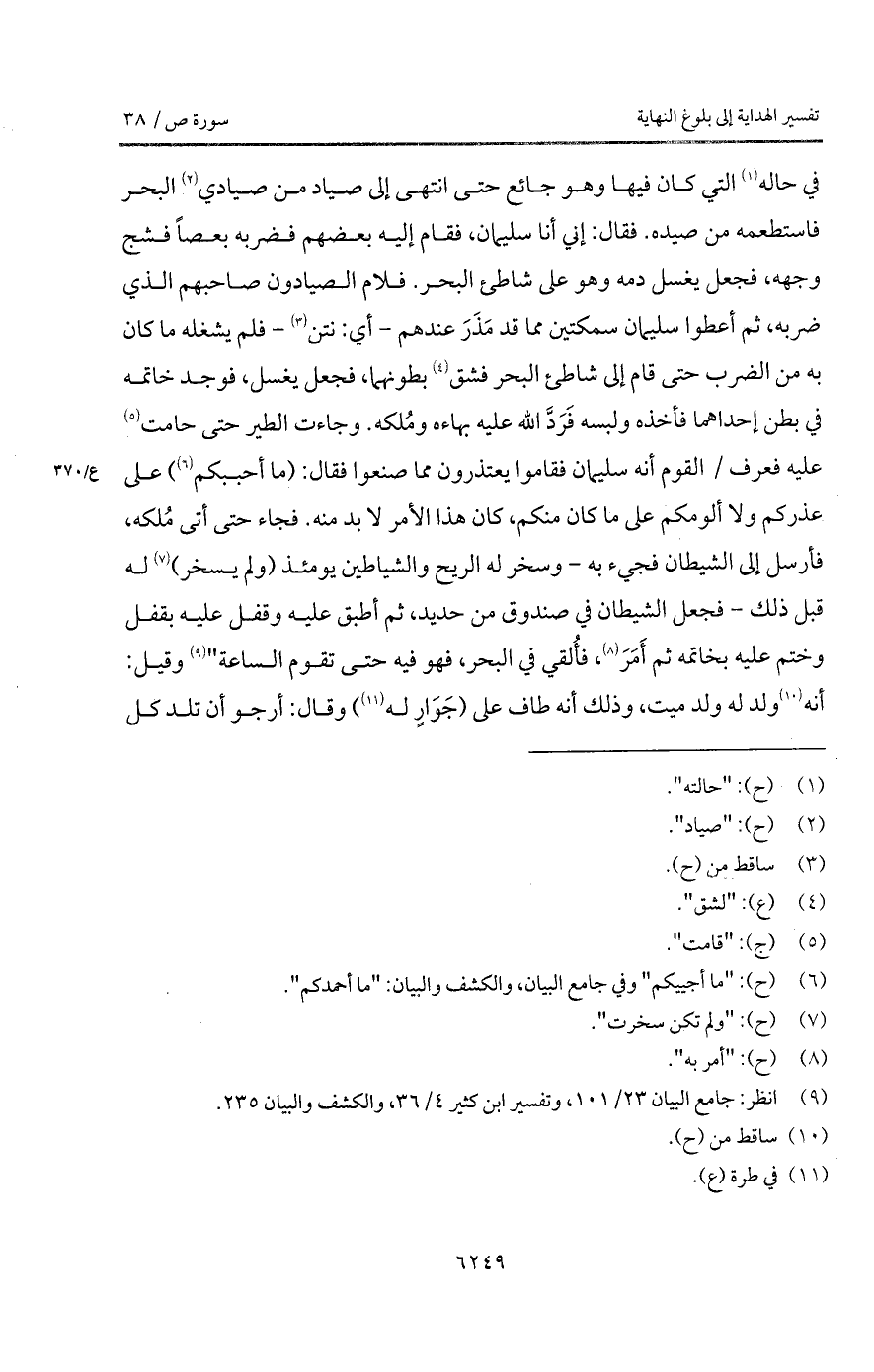 وجاءت الطير حتى حامتا عليه فعرف / القوم أنه سليمان فقاموا يعتذرون مما صنعوا فقال: (ما أحببكم) على عذركم ولا ألومكم عل ما كان منكم، كان هذا الأمر لا بد منه. فجاء حتى أتى مُلكه، فأرسل إلى الشيطان فجيء به - وسخر له الريح والشياطين يومئذ (ولم يسخر) له قبل ذلك - فجعل الشيطان في صندوق من حديد، ثم أطبق عليه وقفل عليه بقفل وختم عليه بخاتمه ثم أَمَرَ، فأُلقي في البحر، فهو فيه حتى تقوم الساعة " وقيل: أنه ولد له ولد ميت، وذلك أنه طاف على (جَوَارٍ له) وقال: أرجو أن تلد كل