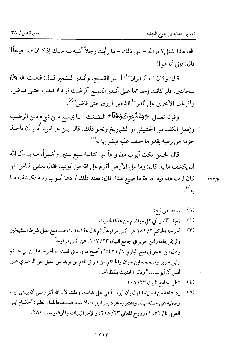 قال الحسن مكث أيوب مطروحاً على كناسة سبع سنين وأشهراً، ما يسأل الله أن يكشف ما به. قال: وما على الأرض أكرم على الله من أيوب. فقال بعض الناس: لو كان لرب هذا فيه ما ضيع هذا. قال: فعند ذلك / دعا أيوب ربه فكشف ما به.