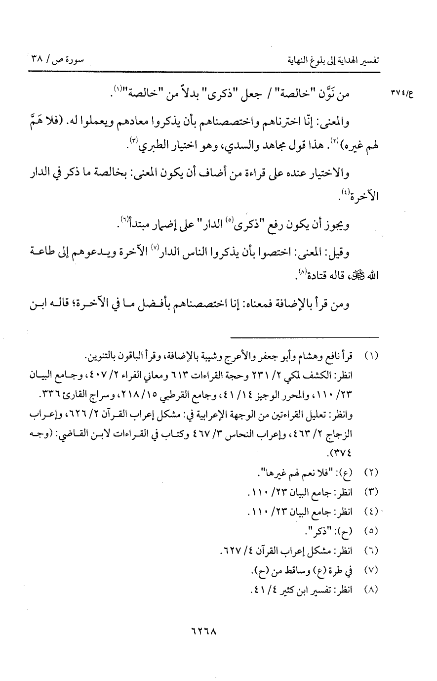 والاختيار عنده على قراءة من أضاف أن يكون المعنى: بخالصة ما ذكر في الدار الآخرة.