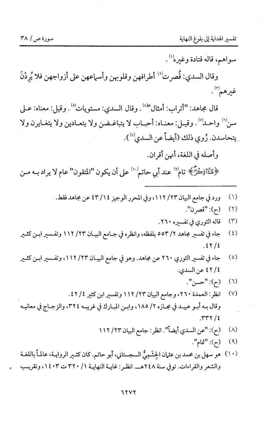 قال مجاهد: " أتراب: أمثال ". وقال السدي: مستويات. وقيل: معناه: على سن واحد. وقيل: معناه: أحباب لا يتباغضن ولا يتعادين ولا يتغايرن ولا يتحاسدن. رُوي ذلك (أيضاً عن السدي).