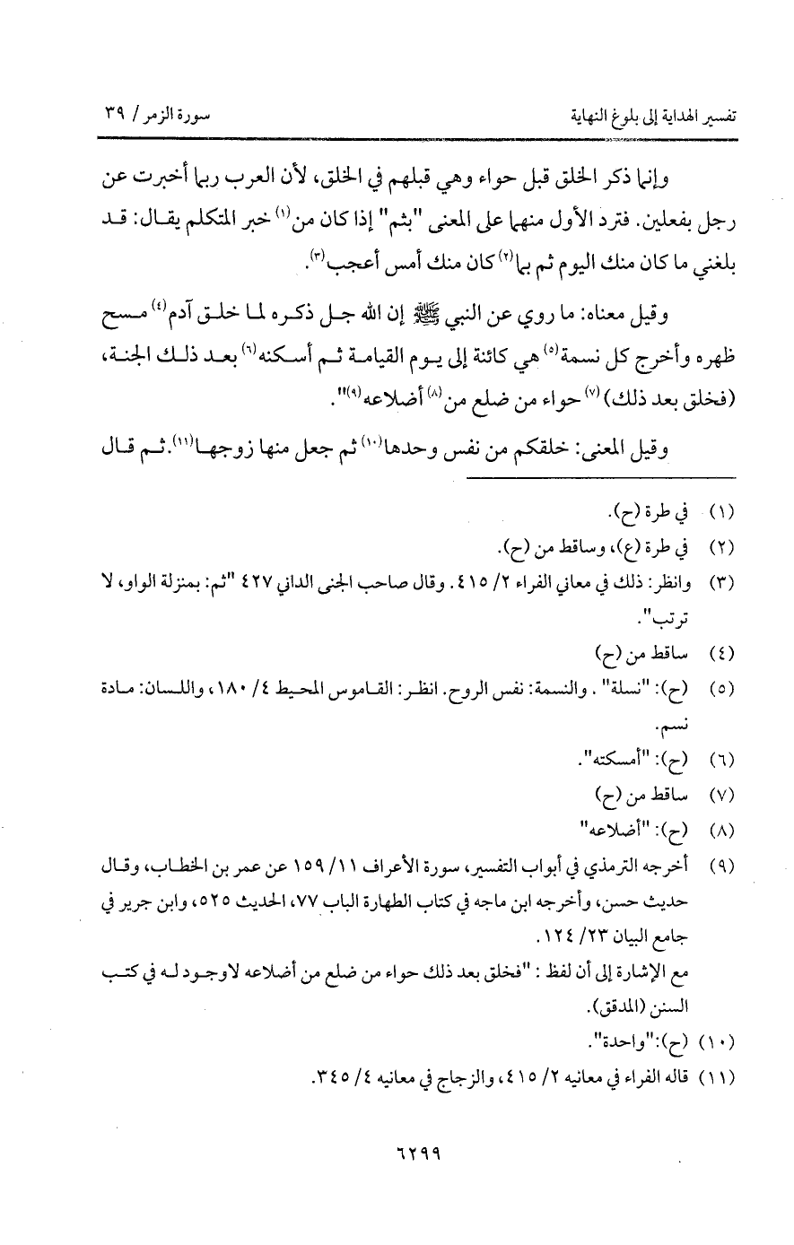 وقيل معناه: " ما روي عن النبي A إن الله جل ذكره لما خلق آدم مسح ظهره وأخرج كل نسمة هي كائنة إلى يوم القيامة ثم أسكنه بعد ذلك الجنة، (فخلق بعد ذلك) حواء من ضلع من أضلاعه ".