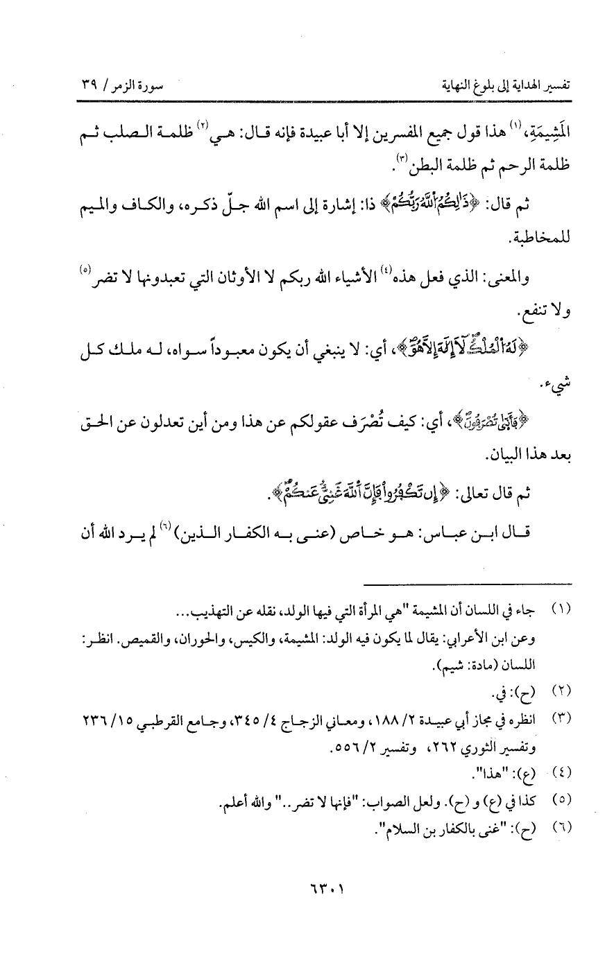 المَشِيمَةِ، هذا قول جميع المفسرين إلا أبا عبيدة فإنه قال: هي ظلمة الصلب ثم ظلمة الرحم ثم ظلمة البطن.