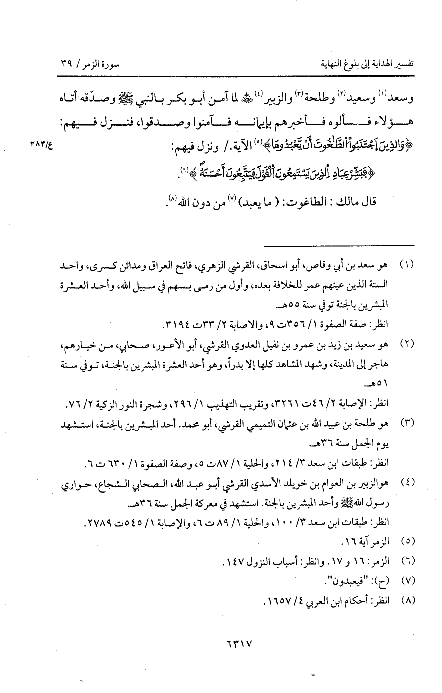 وسعد وسعيد وطلحة والزبير Bهم لما آمن أبو بكر بالنبي A وصدّقه أتاه هؤلاء فسألوه فأخبرهم بإيمانه فآمنوا وصدقوا، فنزل فيهم: {والذين اجتنبوا الطاغوت أَن يَعْبُدُوهَا} الآية.
