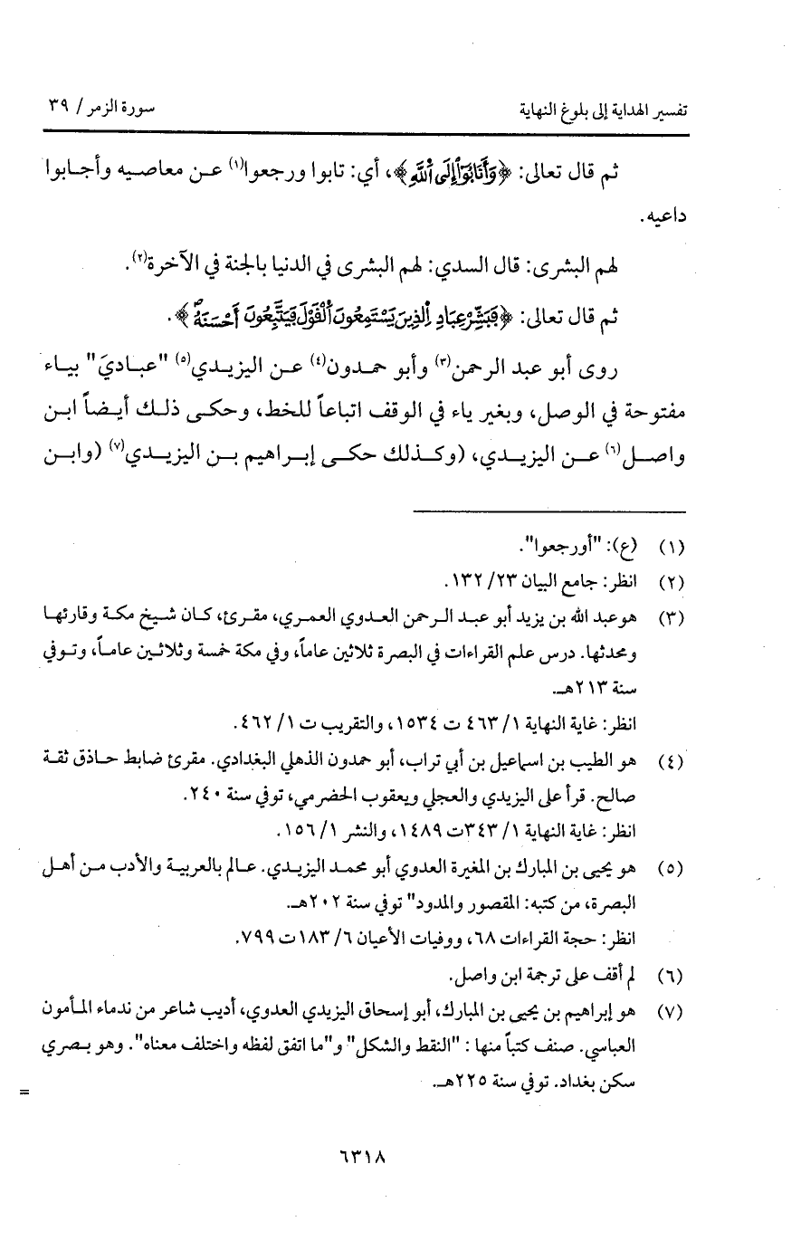 روى أبو عبد الرحمن وأبو حمدون عن اليزيدي " عباديَ " بياء مفتوحة في الوصل، وبغير ياء في الوقف اتباعاً للخط، وحكى ذلك أيضاً ابن واصل عن اليزيدي، (وكذلك حكى إبراهيم بن اليزيدي (وابن