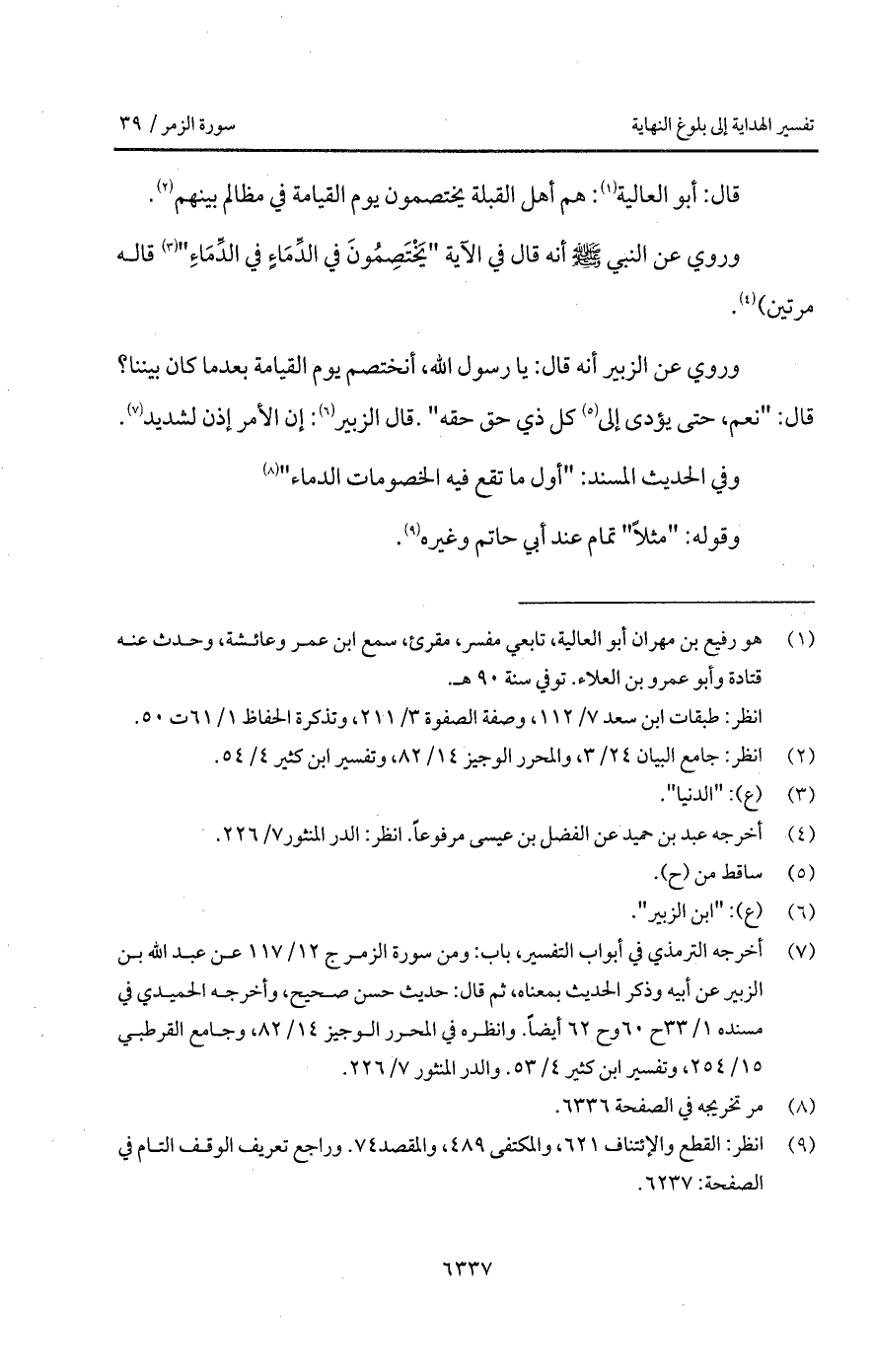 " وروي عن الزبير أنه قال: يا رسول الله، أنختصم يوم القيامة بعدما كان بيننا؟ قال: " نعم، حتى يؤدى إلى كل ذي حق حقه ". قال الزبير: إن الأمر إذن لشديد ".