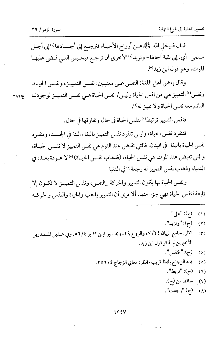 قال فيخلي الله D عن أرواح الأحياء فترجع إلى أجسادها إلى أجل مسمى - أي: إلى بقية آجالها - وتريد الأخرى أن ترجع فيحبس التي قضى عليها الموت، وهو قول ابن زيد.