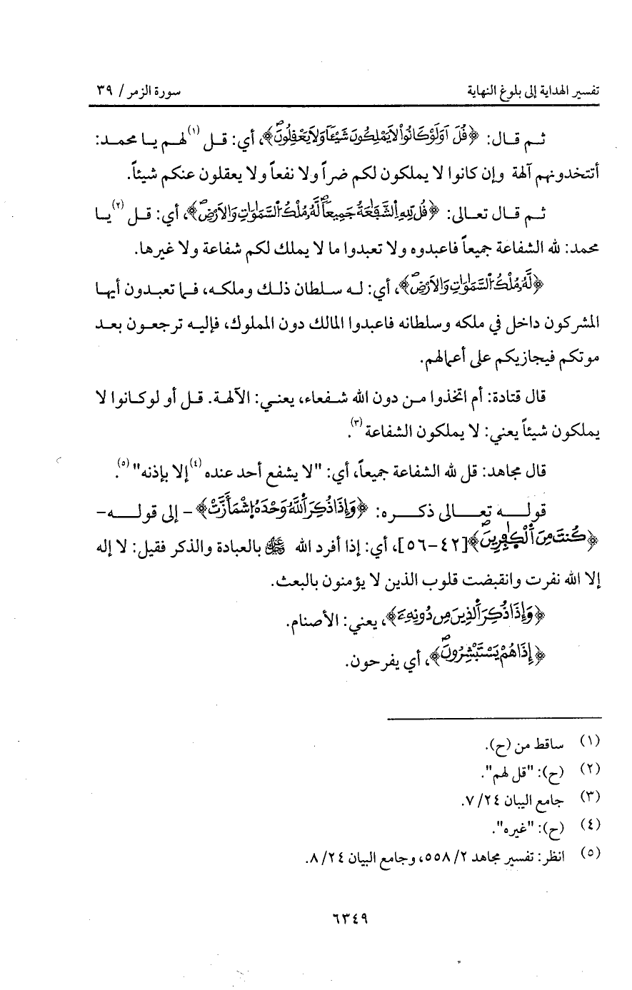 قوله تعالى ذكره: {وَإِذَا ذُكِرَ الله وَحْدَهُ اشمأزت} - إلى قوله - {وَكُنتَ مِنَ الكافرين}، أي: إذا أفرد الله D بالعبادة والذكر فقيل: لا إله إلا الله نفرت وانقبضت قلوب الذين لا يؤمنون بالبعث.