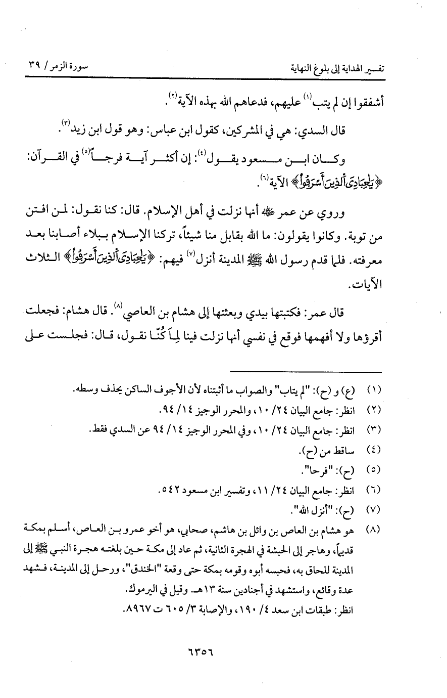 قال عمر: فكتبتها بيدي وبعثتها إلى هشام بن العاصي. قال هشام: فجعلت أقرؤها ولا أفهمها فوقع في نفسي أنها نزلت فينا لِمَا كُنَّا نقول، قال: فجلست