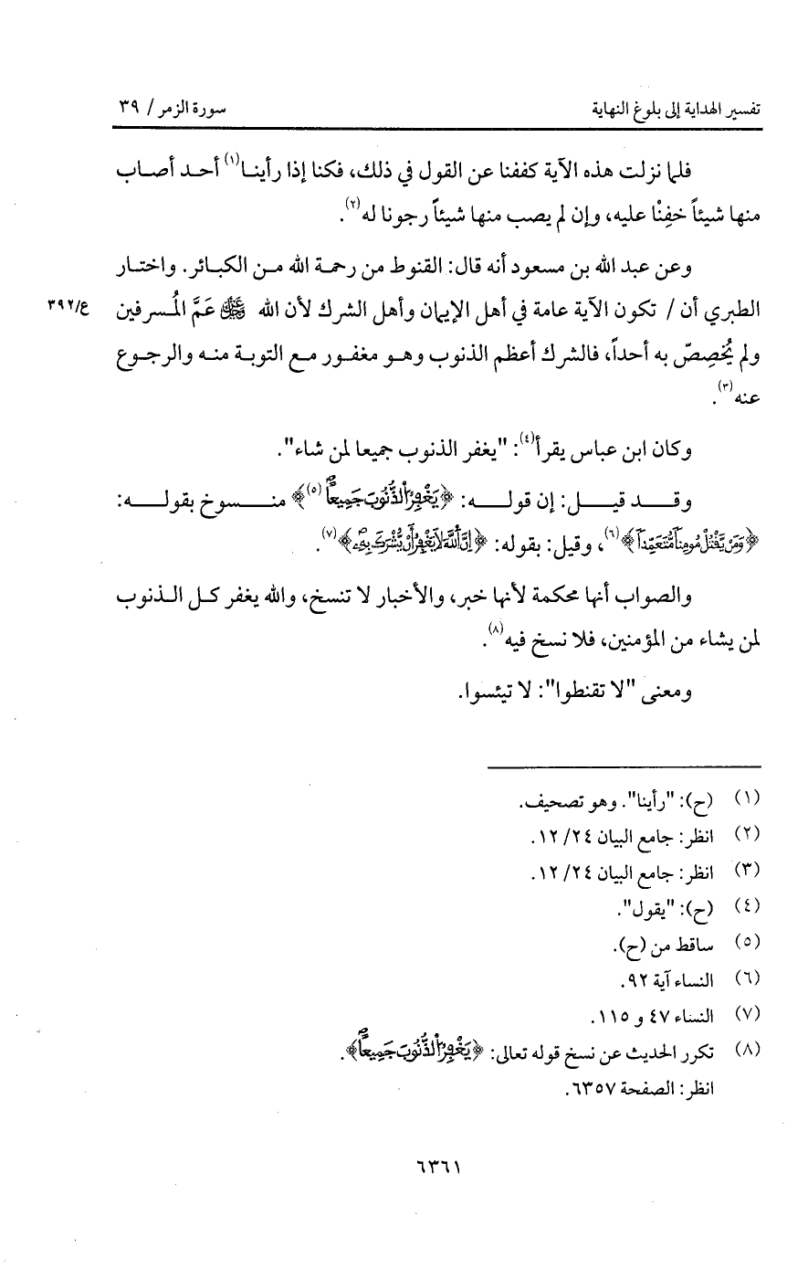 وقد قيل: إن قوله: {يَغْفِرُ الذنوب جَمِيعاً} منسوخ بقوله: {وَمَن يَقْتُلْ مُؤْمِناً مُّتَعَمِّداً} [النساء: 93]، وقيل: بقوله: {إِنَّ الله لاَ يَغْفِرُ أَن يُشْرَكَ بِهِ} [النساء: 48 و 116].