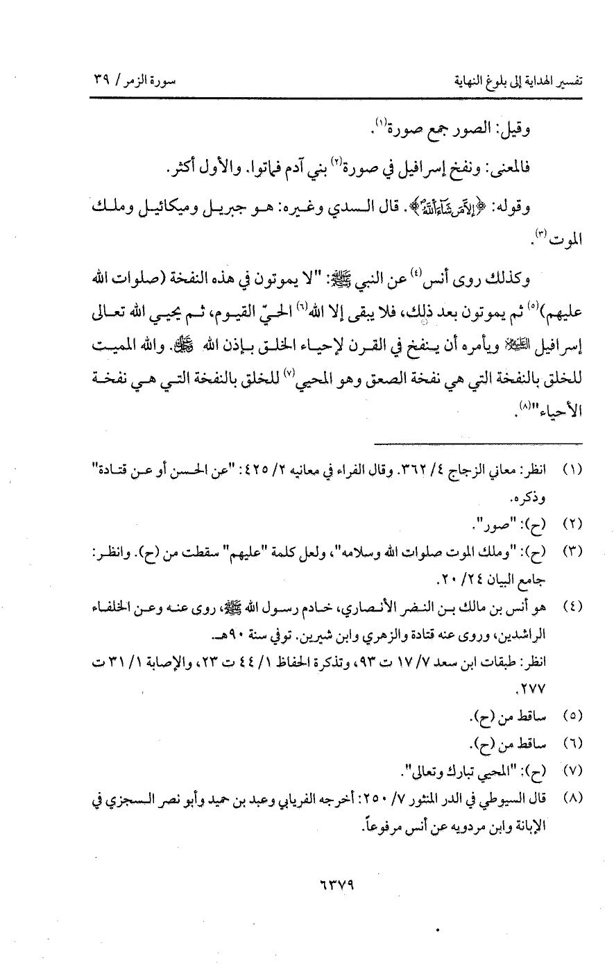 وكذلك روى أنس عن النبي A: " لا يموتون في هذه النفخة (صلوات الله عليهم) ثم يموتون بعد ذلك، فلا يبقى إلا الله الحيّ القيوم، ثم يحيي الله تعالى إسرافيل عليه السلام ويأمره أن ينفخ في القرن لإحياء الخلق بإذن الله D. والله المميت للخلق بالنفخة التي هي نفخة الصعق وهو المحيي للخلق بالنفخة التي هي نفخة الأحياء ".