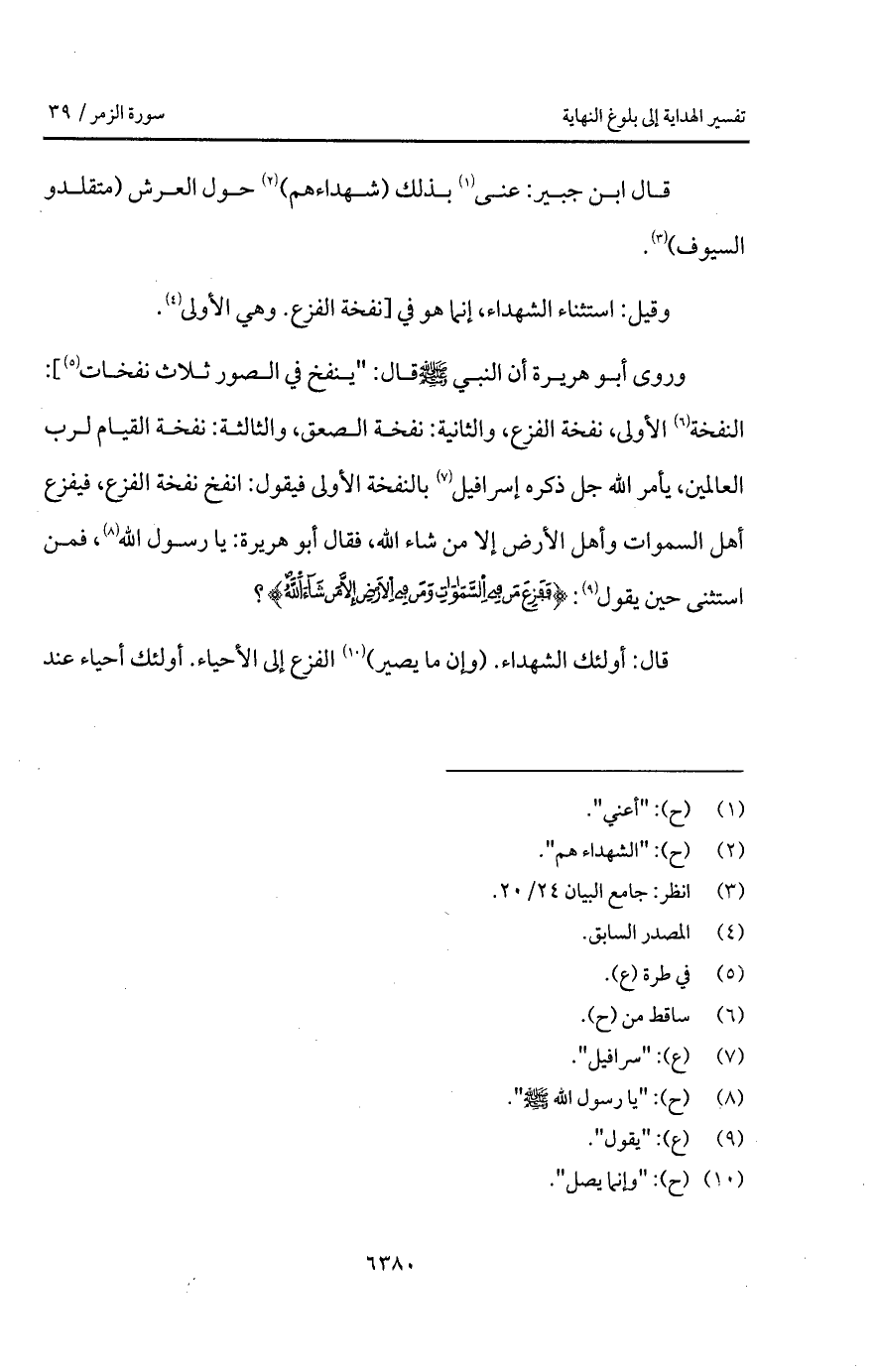 وروى أبو هريرة أن النبي A قال: " ينفخ في الصور ثلاث نفخات]: النفخة الأولى، نفخة الفزع، والثانية: نفخة الصعق، والثالثة: نفخة القيام لرب العالمين، يأمر الله جل ذكره إسرافيل بالنفخة الأولى فيقول: انفخ نفخة الفزع، فيفزع أهل السموات وأهل الأرض إلا من شاء الله، فقال أبو هريرة: يا رسول الله، فمن استثنى حين يقول: {فَفَزِعَ مَن فِي السماوات وَمَن فِي الأرض إِلاَّ مَن شَآءَ الله}؟