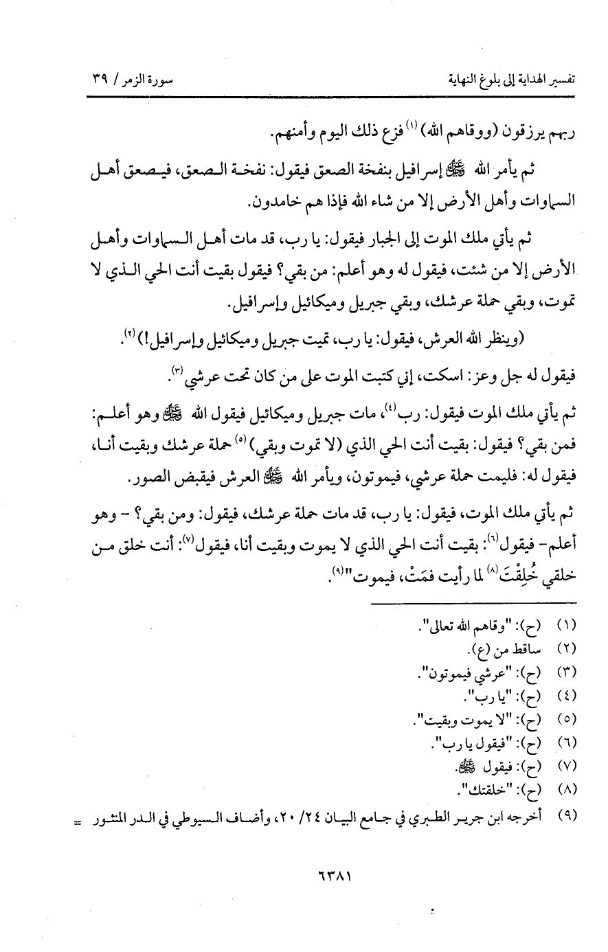 ثم يأتي ملك الموت فيقول: رب، مات جبريل وميكائيل فيقول الله D وهو أعلم: فمن بقي؟ فيقول: بقيت أنت الحي الذي (لا تموت وبقي) حملة عرشك وبقيت أنا، فيقول له: فليمت حملة عرشي، فيموتون، ويأمر الله D العرش فيقبض الصور.