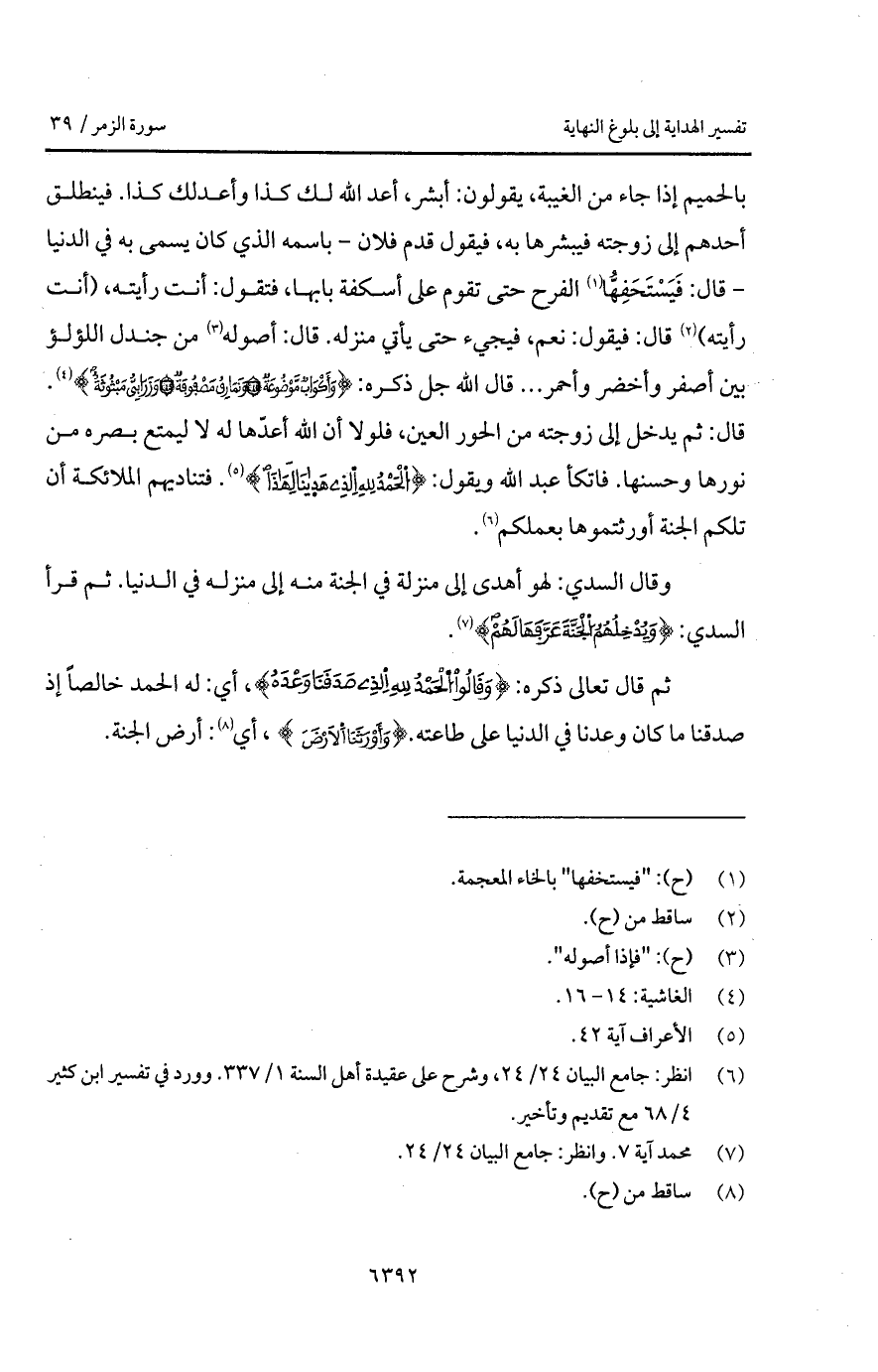 بالحميم إذا جاء من الغيبة، أبشر، أعد الله لك كذا وأعدلك كذا. فينطلق أحدهم إلى زوجته فيبشرها به، فيقول قدم فلان - باسمه الذي كان يسمى به في الدنيا - قال: فَيَسْتَحِفُّها الفرح حتى تقوم على أسكفة بابها، فتقول: أنت رأيته، (أنت رأيته) قال: فيقول: نعم، فيجيء حتى يأتي منزله. قال: أصوله من جندل اللؤلؤ بين أصفر وأخضر وأحمر. . . قال الله جل ذكره: {وَأَكْوَابٌ مَّوْضُوعَةٌ * وَنَمَارِقُ مَصْفُوفَةٌ * وَزَرَابِيُّ مَبْثُوثَةٌ} [الغاشية: 14 - 16]. قال: ثم يدخل إلى زوجته من الحور العين، فلولا أن الله أعدّها له لا ليمتع بصره من نورها وحسنها. فاتكأ عبد الله ويقول: {الحمد للَّهِ الذي هَدَانَا لهذا} [الأعراف: 43]. فتنازيهم الملائكة أن تلكم الجنة وأورثتموها بعلمكم.