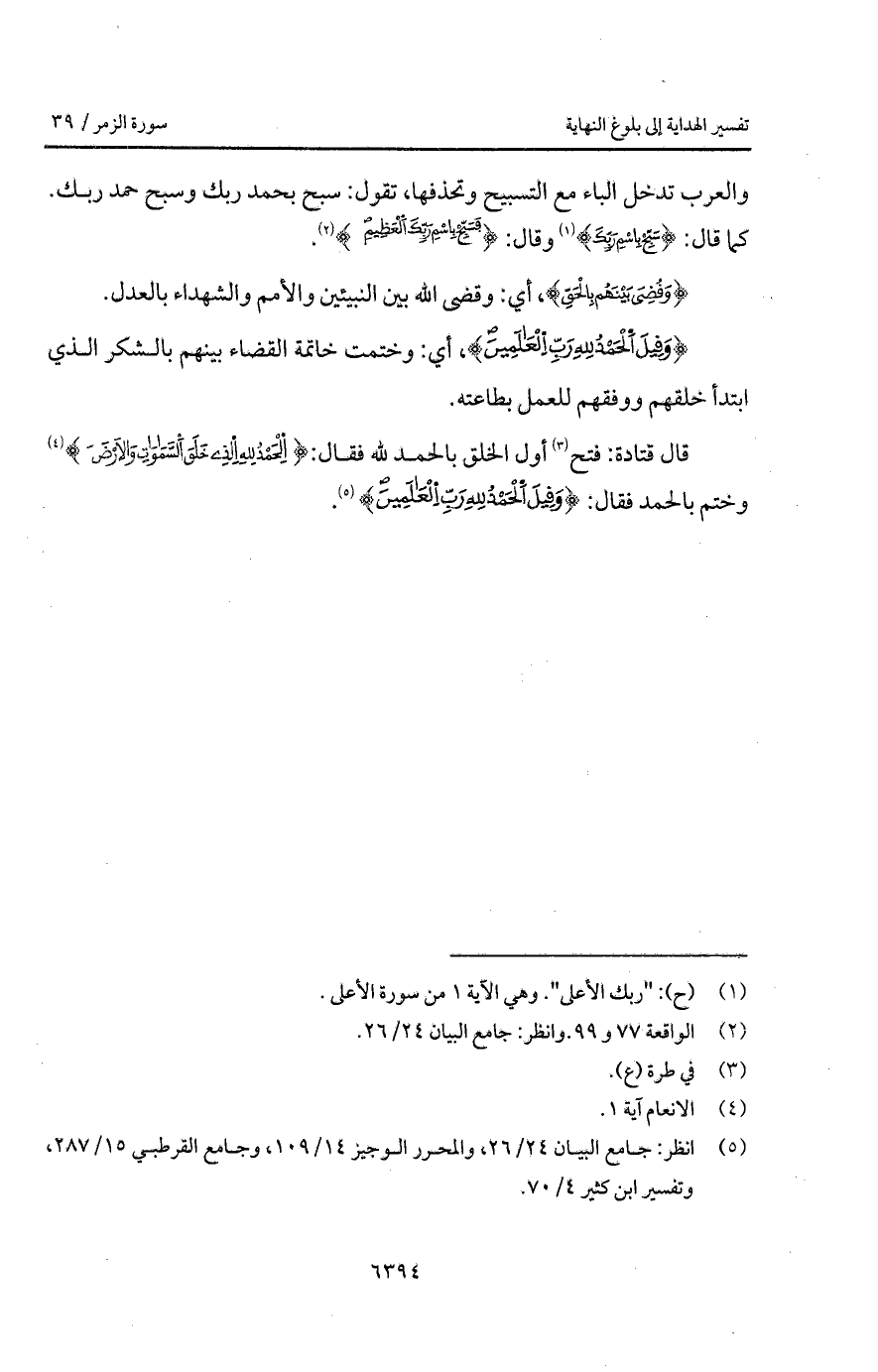 قال قتادة: فتح أول الخلق بالحمد لله فقال: {الحمد للَّهِ الذي خَلَقَ السماوات والأرض} [الأنعام: 1] وختم بالحمد فقال: {وَقِيلَ الحمد لِلَّهِ رَبِّ العالمين}.