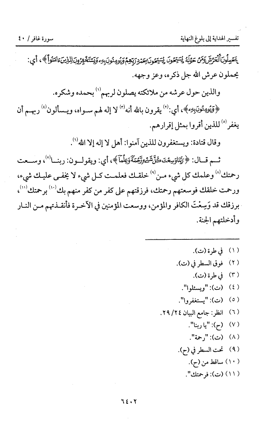 يَحْمِلُونَ العرش وَمَنْ حَوْلَهُ يُسَبِّحُونَ بِحَمْدِ رَبِّهِمْ وَيُؤْمِنُونَ بِهِ وَيَسْتَغْفِرُونَ لِلَّذِينَ آمَنُواْ}، أي: يحملون عرش الله جل ذكره، وعز وجهه.
