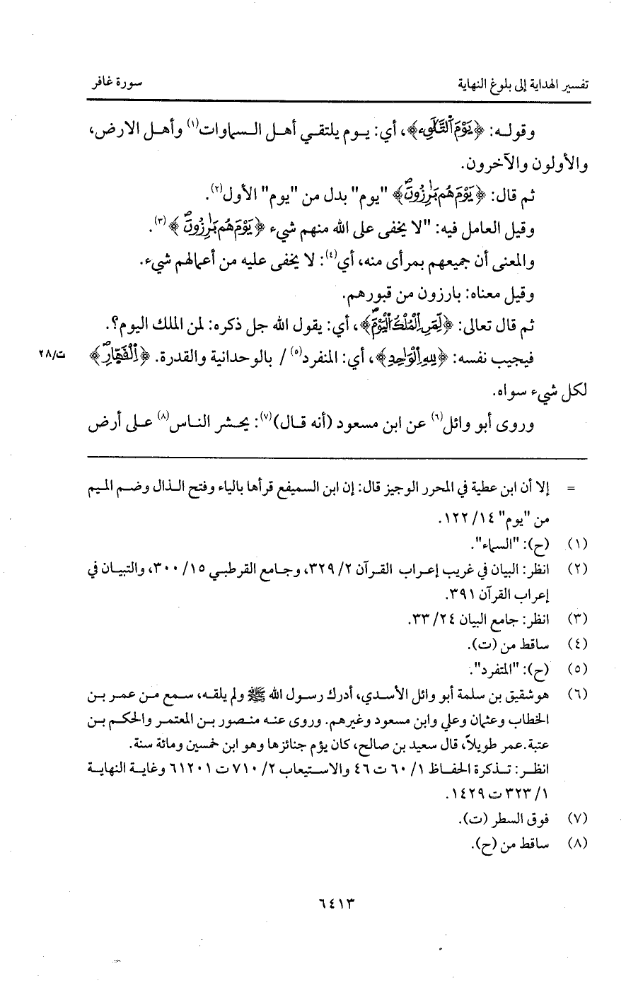وقوله: {يَوْمَ التلاق}، أي: يوم يلتقي أهل السماوات وأهل الأرض، والأولون والآخرون. ثم قال: {يَوْمَ هُم بَارِزُونَ} " يوم " بدل من " يوم " الأول ".