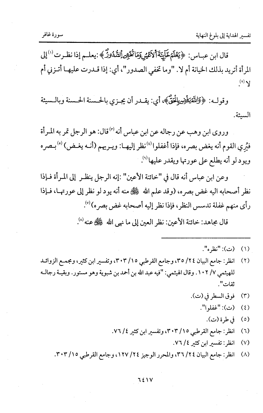 وعن ابن عباس أنه قال في " خائنة الأعين ": إنه الرجل ينظر إلى المرأة فإذا نظر أصحابه إليه غض بصره، (وقد علم الله D منه أنه يود لو نظر إلى عورتها، فإذا رأى منهم غفلة تدسس النظر، فإذا نظر إليه أصحابه غض بصره).