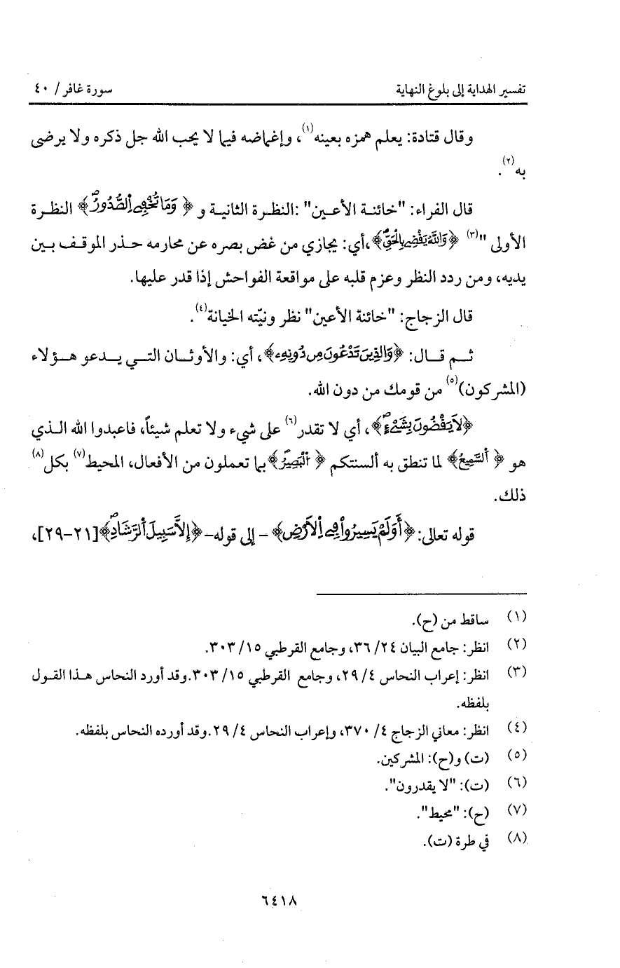 قال الفراء: " خائنة الأعين ": النظرة الثانية و {وَمَا تُخْفِي الصدور} النظرة الأولى " {والله يَقْضِي بالحق}، أي: يجازي من غض بصره عن محارمه حذر الموقف بين يديه، ومن ردد النظر وعزم قلبه على مواقعة الفواحش إذا قدر عليها.