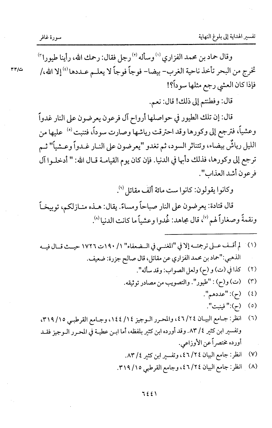 قال: إن تلك الطيور في حواصلها أرواح آل فرعون يعرضون على النار غدواً وعشياً، فترجع إلى وكورها وقد احترقت رياشها وصارت سوداً، فتنبت عليها من الليل رياشٌ بيضاء، وتتناثر السود، ثم تغدو " يعرضون على النار غدواً وعشياً " ثم ترجع إلى وكورها، فذلك دأبها في الدنيا.