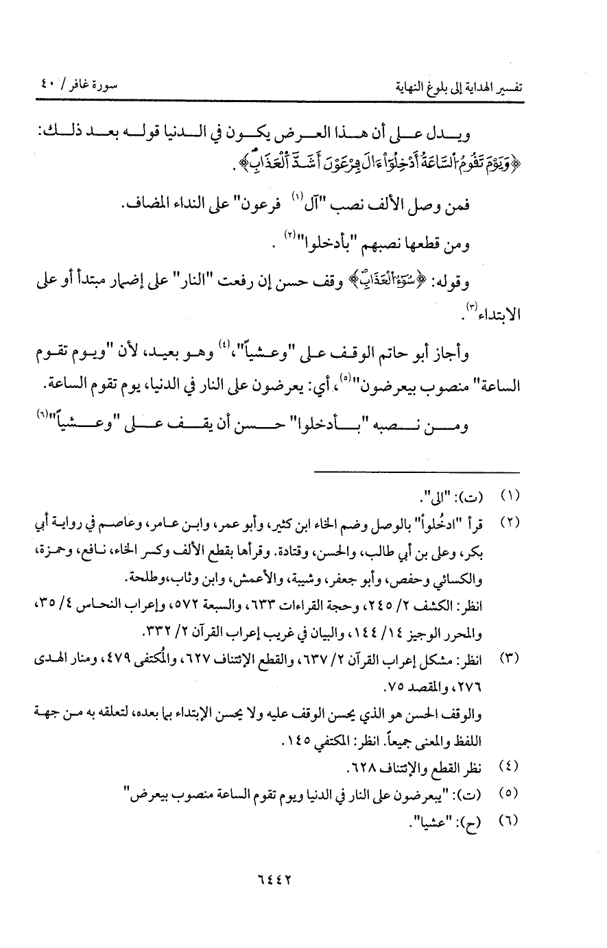 وأجاز أبو حاتم الوقف على " وعشياً "، وهو بعيد، لأن " ويوم تقوم الساعة " منصوب بيعرضون، أي: يعرضون على النار في الدنيا، يوم تقوم الساعة. ومن نصبه " بأدخلوا " حسن أن يقف على " وعشياً "