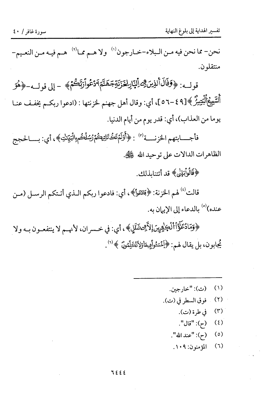 قوله: {وَقَالَ الذين فِي النار لِخَزَنَةِ جَهَنَّمَ ادعوا رَبَّكُمْ} - إلى قوله - {هُوَ السميع البصير}، أي: وقال أهل جهنم لخزنتها: (ادعوا ربكم يخفف عنا يوما من العذاب)، أي: قدر يوم من أيام الدنيا.