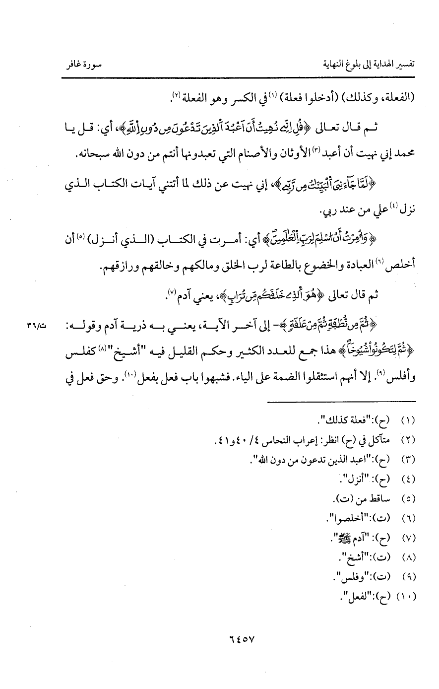 {ثُمَّ مِن نُّطْفَةٍ ثُمَّ مِنْ عَلَقَةٍ} - إلى آخر الآية، يعني به ذرية آدم وقوله: {ثُمَّ لِتَكُونُواْ شُيُوخاً} هذا جمع للعدد الكثير وحكم القليل فيه " أشيخ " كفلس وأفلس. إلا أنهم استثقلوا الضمة على الياء. فشبهوا باب فعل بفعل. وحق فعل في