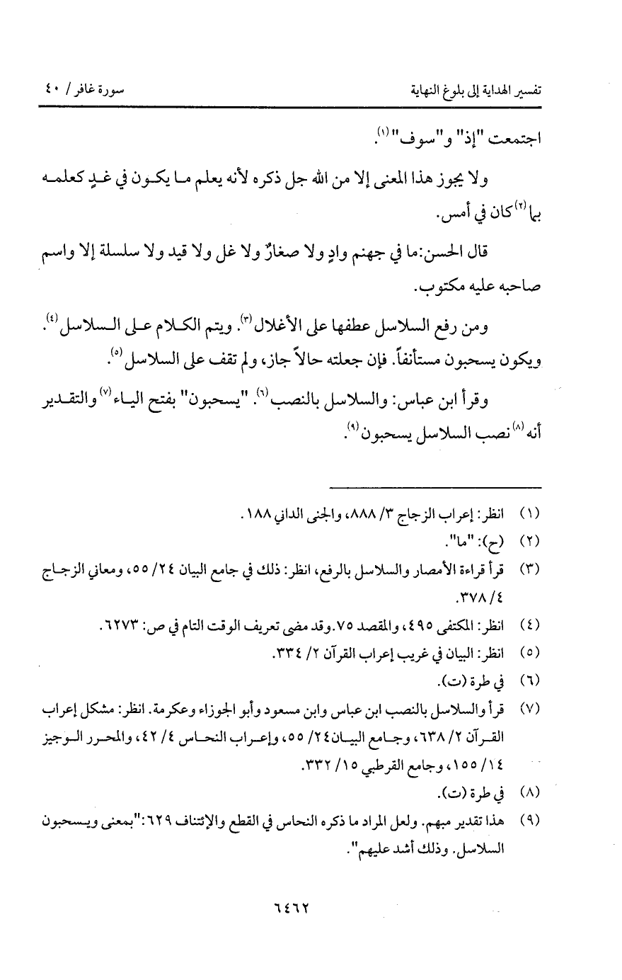 قال الحسن: ما في جهنم وادٍ ولا صغارٌ ولا غل ولا قيد ولا سلسلة إلا واسم صاحبه عليه مكتوب. ومن رفع السلاسل عطفها على الأغلال. ويتم الكلام على السلاسل. ويكون يسحبون مستأنفاً. فإن جعلته حالاً جاز، ولم تقف على السلاسل.