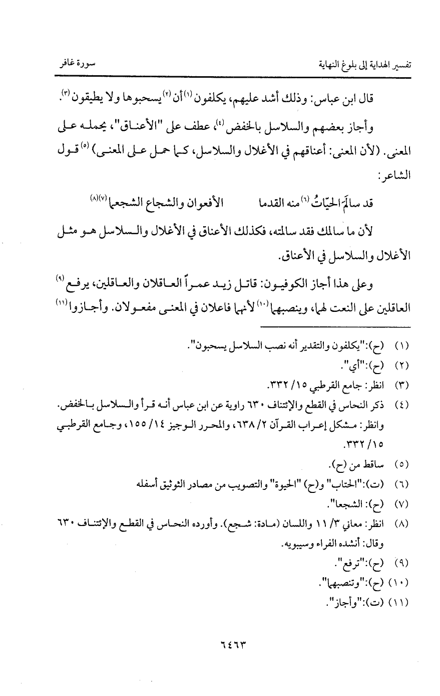 وأجاز بعضهم والسلاسل بالخفض، عطف على الأعناق "، يحمله على المعنى. (لأن المعنى: أعناقهم في الأغلال والسلاسل، كما حمل على المعنى) قول الشاعر: