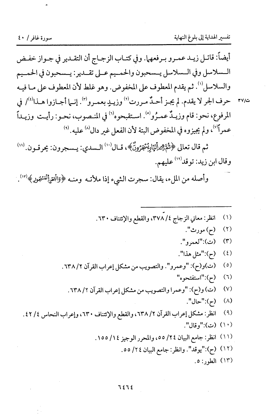 أيضاً: قاتل زيد عمرو برفعهما. وفي كتاب الزجاج أن التقدير في جواز خفض السلاسل وفي السلاسل يسحبون والحميم على تقدير: يسحبون في الحميم والسلاسل. ثم يقدم المعطوف على المخفوض. وهو غلط لأن المعطوف على ما فيه حرف الجر لا يقدم. لم يجز أحدٌ مررت وزيدٍ بعمرو. إنما أجازوا هذا / في المرفوع، نحو: قام وزيدٌ عمرو. استقبحوه في المنصوب، نحو: رايت وزيداً عمراً، ولم يجيزوه في المخفوض البتة لأن الفعل غير دال عليه.