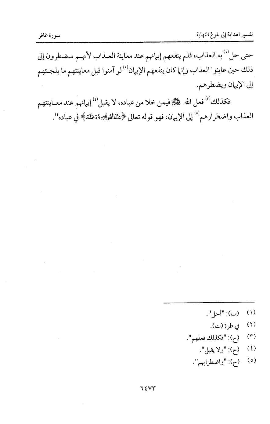 فكذلك فعل الله D فيمن خلا من عباده، لا يقبل إيمانهم عند معاينتهم العذاب واضطرارهم إلى الإيمان، فهو قوله تعالى {سُنَّتَ الله التي قَدْ خَلَتْ} في عباده ".