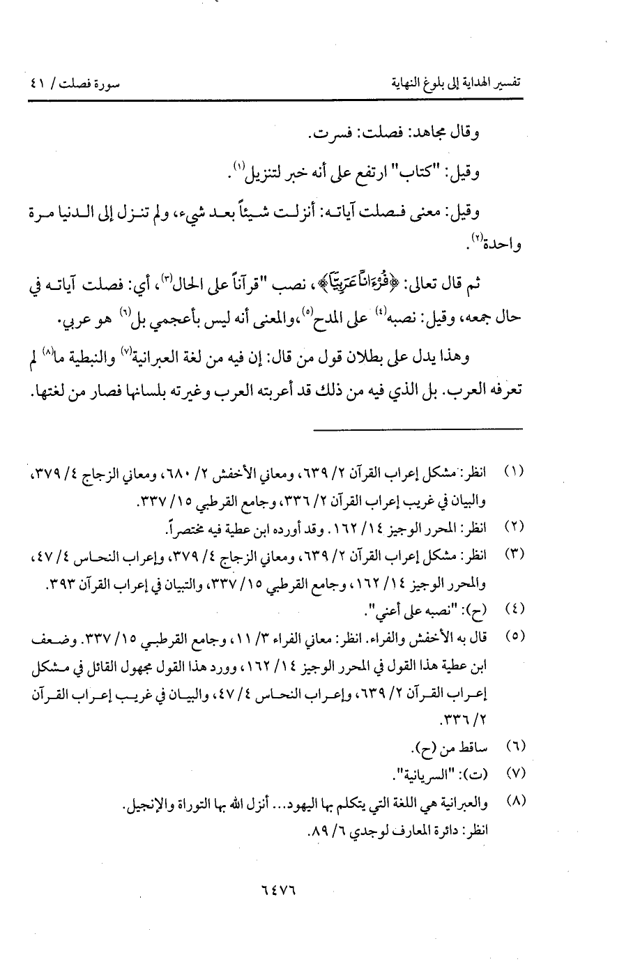 ثم قال تعالى: {قُرْآناً عَرَبِيّاً}، نصب " قرآناً على الحال، أي: فصلت آياته في حال جمعه، وقيل: نصبه على المدح، والمعنى أنه ليس بأعجمي بل هو عربي.