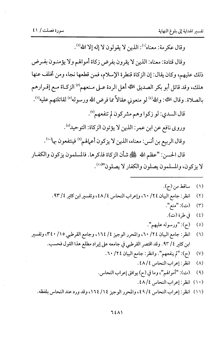 وقال قتادة: معناه: الذين لا يقون بفرض زكاة أموالهم ولا يؤمنون بفرض ذلك عليهم، وكان يقال: إن الزكاة قنطرة الإسلام، فمن قطعها نجا، ومن تخلف عنها هلك، وقد قاتل أبو بكر الصديق Bهـ أهل الردة على منعهم الزكاة مع إقرارهم بالصلاة. وقال Bهـ: والله لو منعوني عقالاً مما فرض الله ورسوله لقاتلتهم عليه.