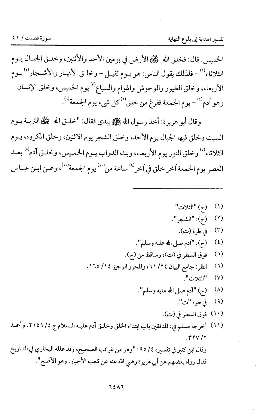 وقال أبو هريرة: " أخذ رسول الله A بيدي فقال: " خلق الله D التربة يوم السبت وخلق فيها الجبال يوم الأحد، وخلق الشجر يوم الاثنين، وخلق المكروه، يوم الثلاثاء وخلق النور يوم الأربعاء، وبث الدواب يوم الخميس، وخلق آدم بعد العصر يوم الجمعة آخر خلق في آخر ساعة من يوم الجمعة "، وعن ابن عباس