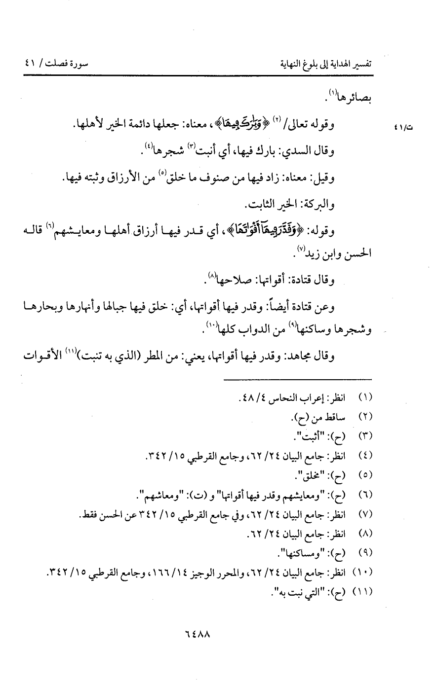 وعن قتادة أيضاً: وقدر فيها أقواتها، أي: خلق فيها جبالها وبحارها وشجرها وساكنها من الدواب كلها.