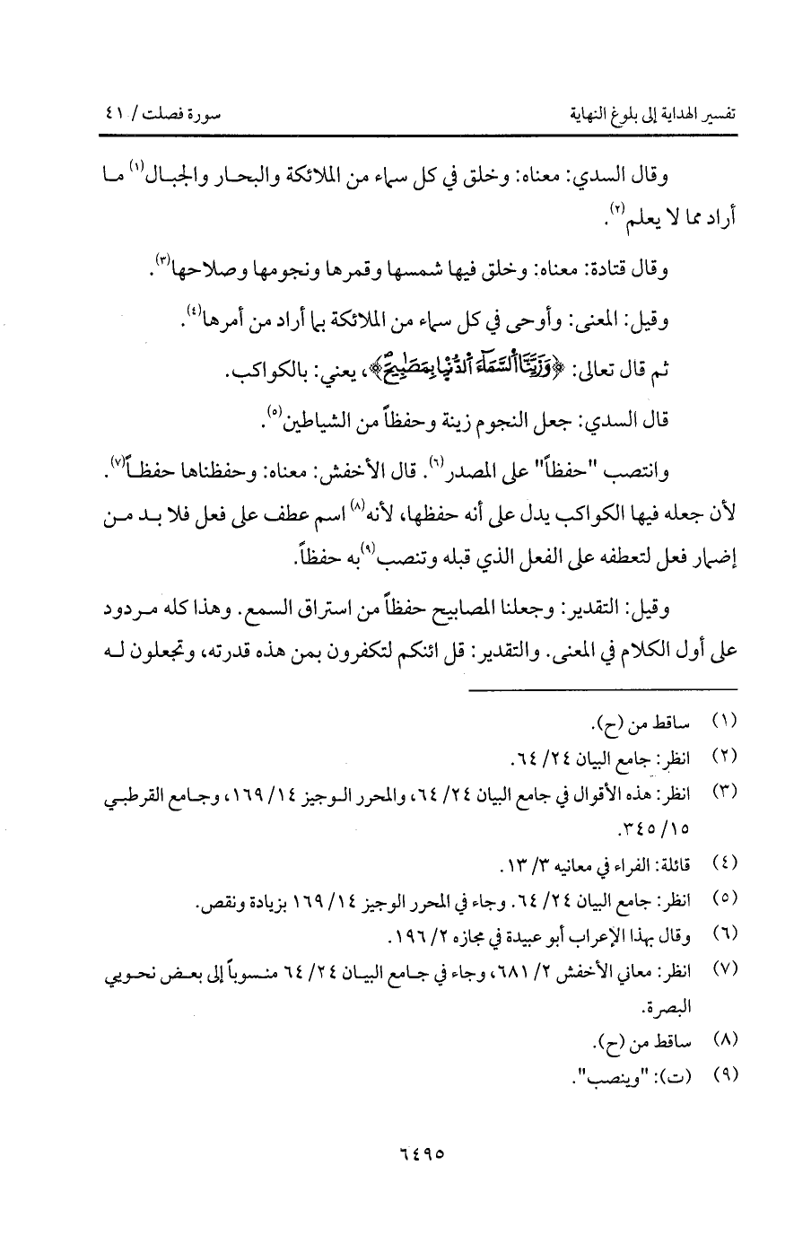 وانتصب " حفظاً " على المصدر. قال الأخفش: معناه: وحفظناه حفظاً. لأن جعله فيها الكواكب يدل على أنه حفظها، لأنه اسم عطف على فعل فلا بد من إضمار فعل لتعطفه على الفعل الذي قبله وتنصب به حفظاً.