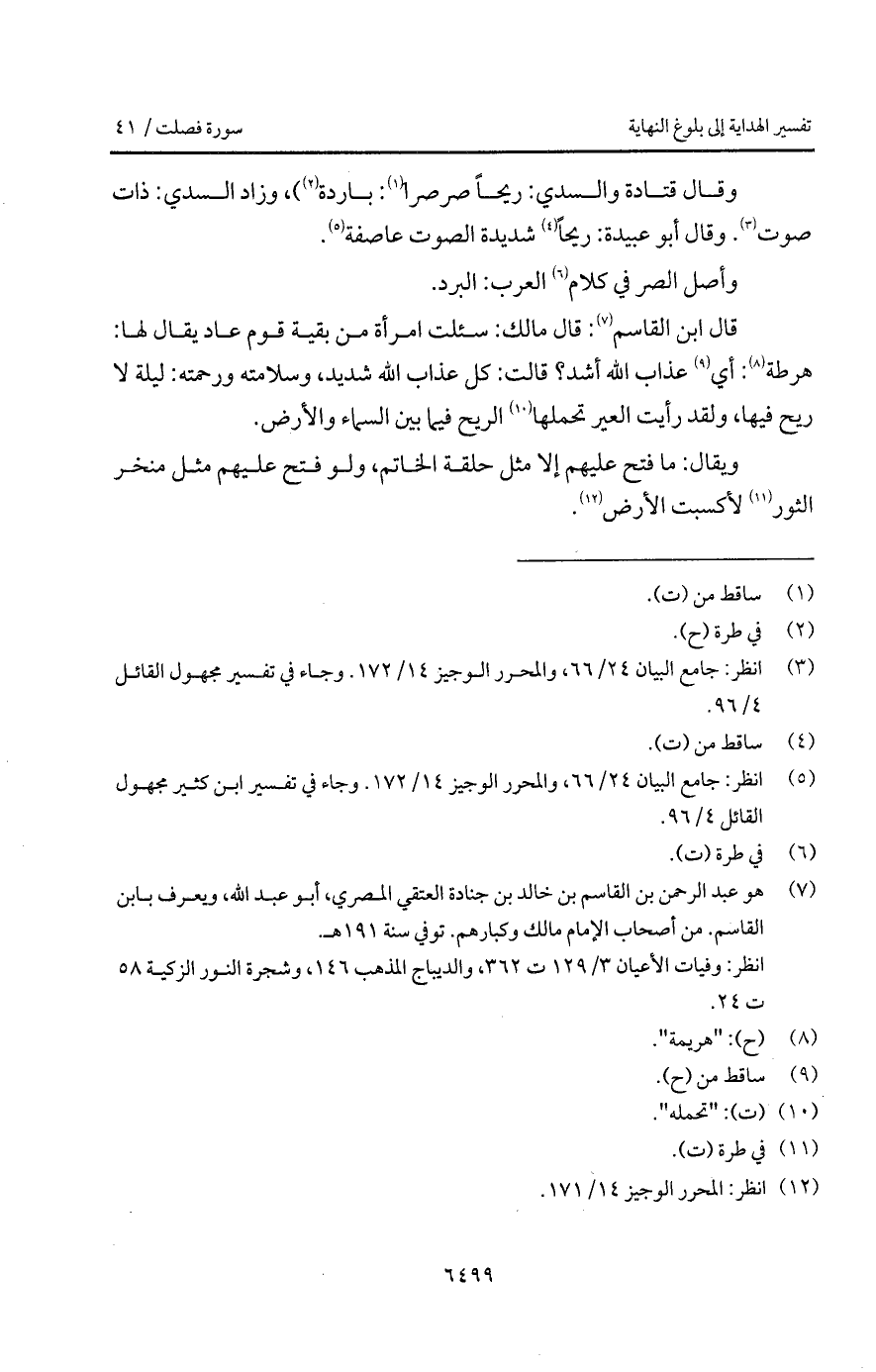 وقال قتادة والسدي: ريحاً صرصراً: باردة)، وزاد السدي: ذات صوت. وقال أبو عبيدة: ريحاً شديدة الصوت عاصفة.