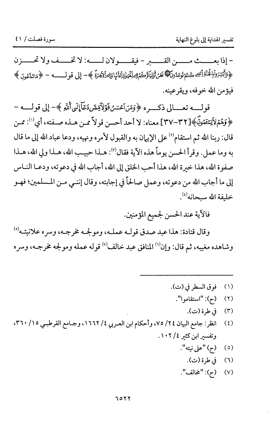 قوله تعالى ذكره {وَمَنْ أَحْسَنُ قَوْلاً مِّمَّن دَعَآ إِلَى الله} - إلى قوله - {وَهُمْ لاَ يَسْئَمُونَ} معناه: لا أحد أحسن قولاً ممن هذه صفته، أي: ممن قال: ربنا الله ثم استقام على الإيمان به والقبول لأمره ونهيه، ودعا عباد الله إلى ما قال به وما عمل. وقرأ الحسن يوماً هذه الآية فقال: هذا حبيب الله، هذا ولي والله، هذا صفوة الله، هذا خير الله، هذا أحب الخلق إلى الله، أجاب الله في دعوته، ودعا الناس إلى ما أجاب الله من دعوته، وعمل صالحاً في إجابته، وقال إنني من المسلمين؛ فهو خليفة الله سبحانه.
